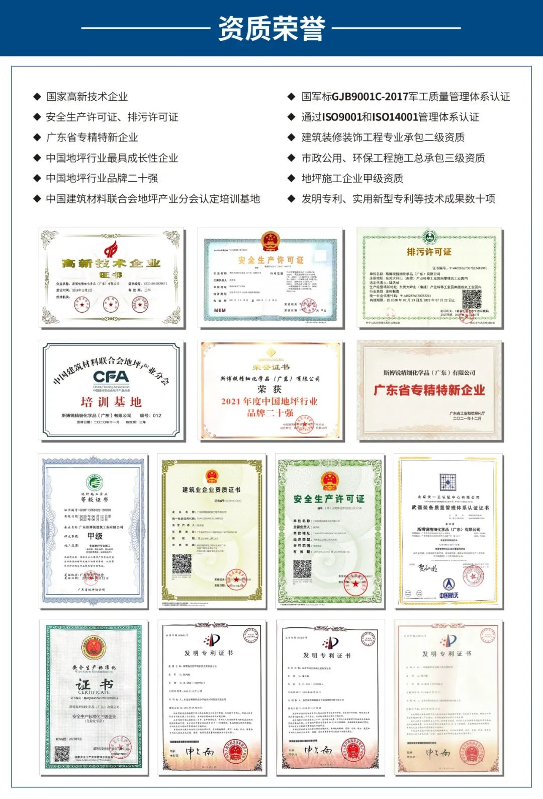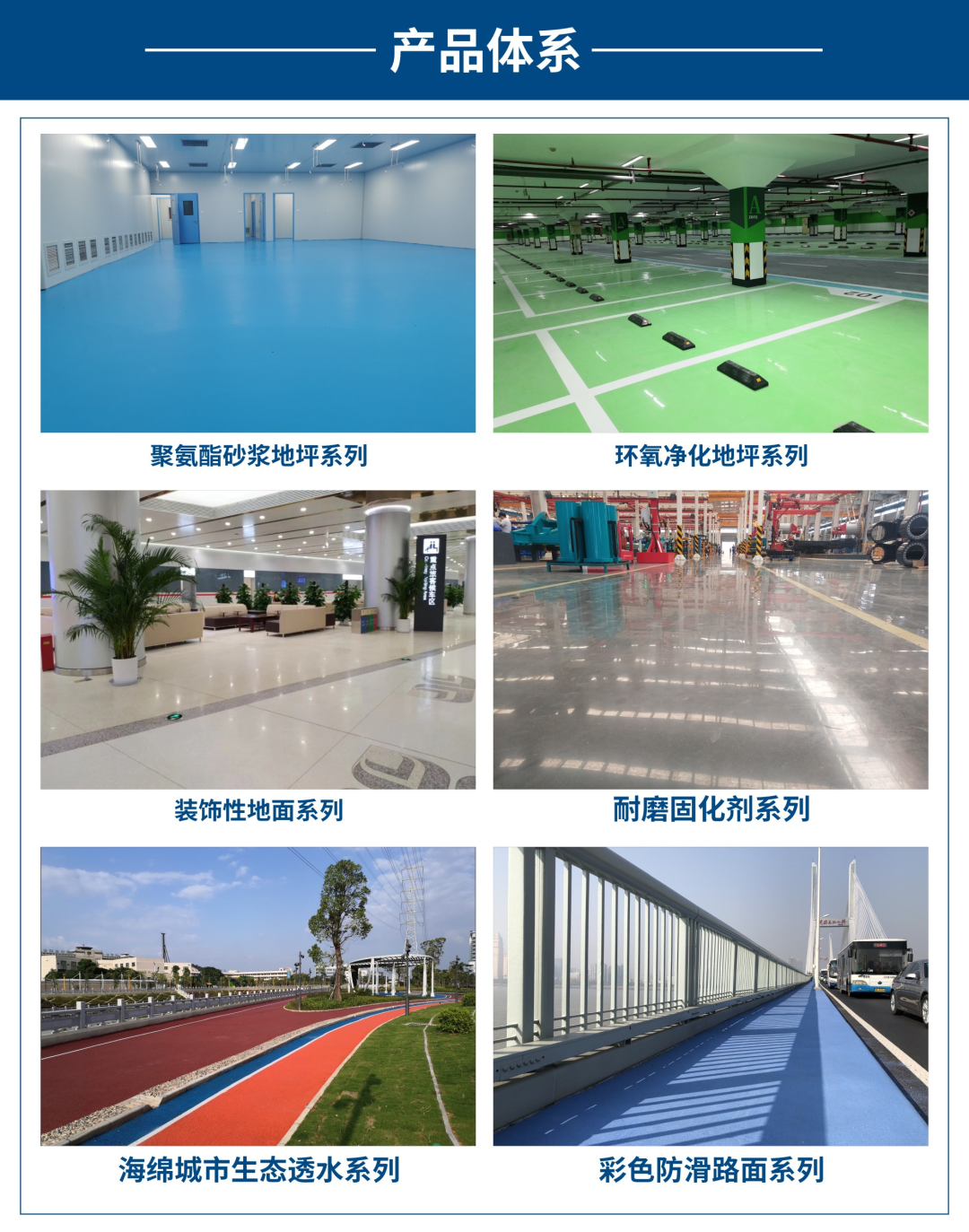近年来,斯博锐积极践行“引领行业发展,创造绿色生活”的发展理念,聚焦主流客户,紧紧围绕产品研发、完善产业结构,不断更新健全产品体系,成功开发了覆盖全体系地面应用的六大产品体系:海绵城市生态透水系列、彩色防滑路面系列、聚氨酯砂浆系列、装饰性地面系列、耐磨固化剂系列、环氧净化地坪系列,产品各项参数指标均达到国际标准,并获得市场的一致好评