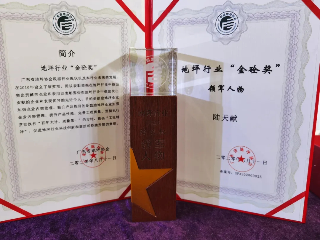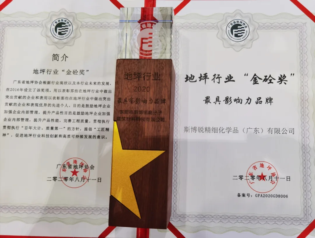 广东省地坪协会成立五周年庆祝大会隆重召开,对行业内有突出贡献的企业和人物进行表彰。斯博锐精细化学品(广东)有限公司荣获地坪行业“金砼奖”最具影响力品牌,董事长陆天献先生分别获得地坪行业“金砼奖”领军人物及2020第10届亚太地坪展特聘专家顾问。